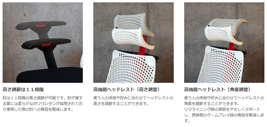 - ・全部入りの機能: 加重微調整リクライニング、可動アジャスタブル肘。必要な機能はすべて完備