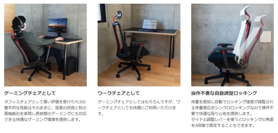 YL9Gは、ゲーミングモデルでありながら、スタイリッシュなモノトーンを基調としています。オフィスに置いても、リビングに置いても「浮かない」。「部屋の雰囲気を壊さないか?」という悩みをデザインの力で解決します。