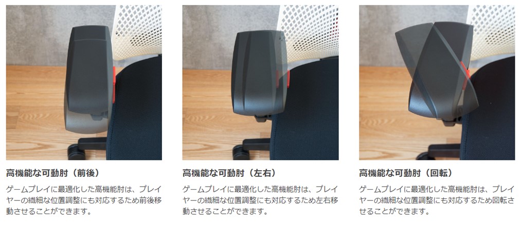 - ・全部入りの機能: 加重微調整リクライニング、可動アジャスタブル肘。必要な機能はすべて完備